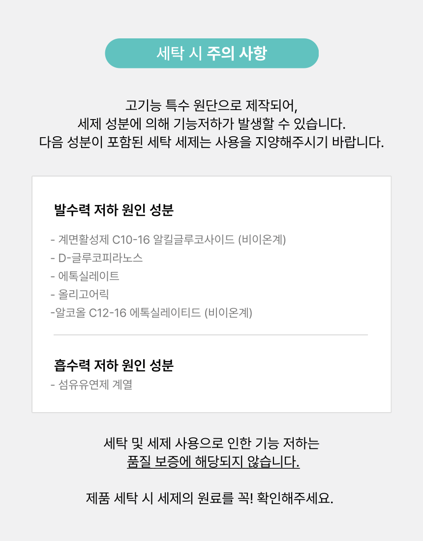 염소, 산소계 표백제는 제품 색상의 변질과 기능저하(흡습건습 및 발수기능)가 생길 수 있으니 사용을 자제해주시고,